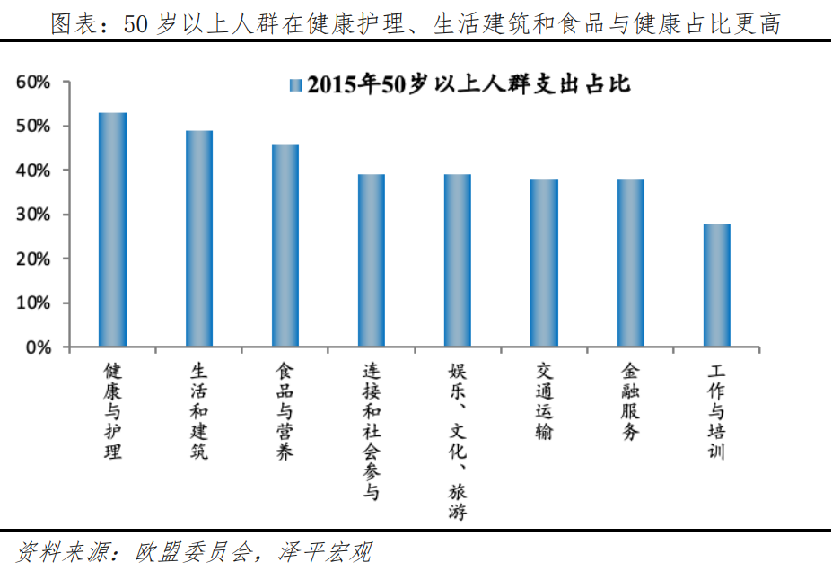 歐洲銀發(fā)經(jīng)濟發(fā)展主要集中于以下三個方面:1)基本功能性產(chǎn)品。為老年人營造友好環(huán)境,將無障礙設施以及老年人所需要的產(chǎn)品和服務納入主流市場。比如醫(yī)療健康、綜合護理服務等。2)生活方式相關(guān)產(chǎn)品。在工作、生活、住房、休閑、旅行、交通等方面,滿足不同老年群體需求。比如老年友好型大學、適老化住房、功能性食品、個性化營養(yǎng)方案、銀發(fā)旅游等。3)升級附加類產(chǎn)品。進行科技化、智能化升級,進而拉動新興市場。比如智能家居、健康管理、安全監(jiān)護、遠程護理、服務機器人等。根據(jù)歐盟委員會《銀發(fā)經(jīng)濟》報告,2015年50歲以上人群支出占比前三名的行業(yè)是健康護理、生活建筑和食品與健康,分別為53%、49%、46%。