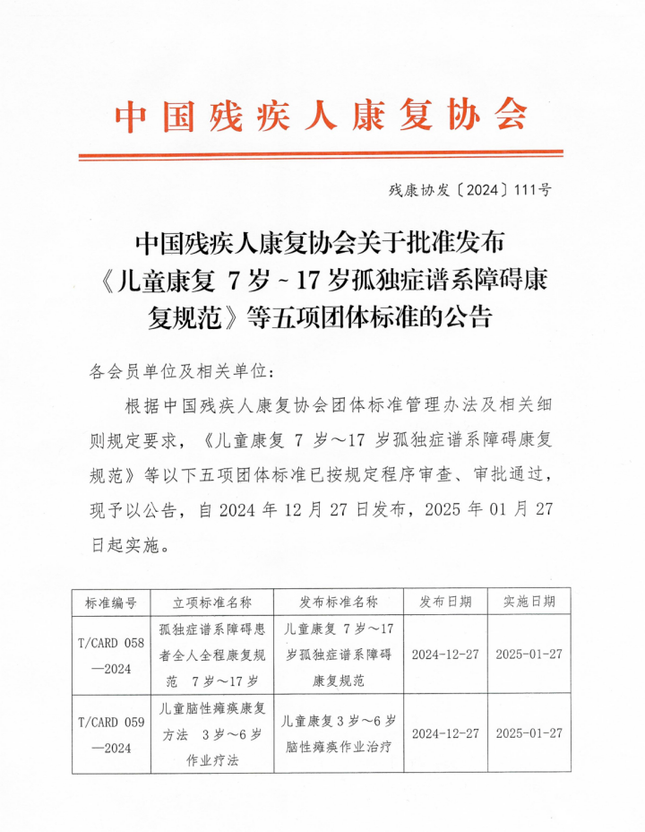 近日,中國(guó)殘疾人康復(fù)協(xié)會(huì)發(fā)布關(guān)于批準(zhǔn)發(fā)布《兒童康復(fù)7歲~17歲孤獨(dú)癥譜系障礙康復(fù)規(guī)范》等五項(xiàng)團(tuán)體標(biāo)準(zhǔn)的公告。公告稱(chēng)《兒童康復(fù)7歲~17歲孤獨(dú)癥譜系障礙康復(fù)規(guī)范》等五項(xiàng)團(tuán)體標(biāo)準(zhǔn)已按規(guī)定程序?qū)彶椤徟ㄟ^(guò),自2024年12月27日發(fā)布,2025年1月27日起實(shí)施。