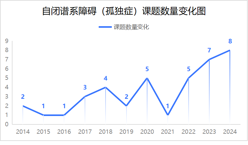 結(jié)合過去 10 年的數(shù)據(jù),自閉譜系障礙(孤獨(dú)癥)相關(guān)課題的數(shù)量變化如下:
