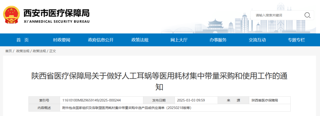 3月3日,陜西省醫(yī)療保障局發(fā)布《關于做好人工耳蝸等醫(yī)用耗材集中帶量采購和使用工作的通知》,其中指出,自2025年3月31日起執(zhí)行人工耳蝸、乳房旋切針、血管組織閉合用結扎夾、導引導管和導引導絲、預充式導管沖洗器等醫(yī)用耗材集中帶量采購中選結果;自2025年5月1日起執(zhí)行外周血管支架集采中選結果。其中人工耳蝸、外周血管支架、乳房旋切針采購周期3年,血管組織閉合用結扎來、導引導管和導引導絲接續(xù)采購周期2年,預充式導管沖洗器采購周期1年。