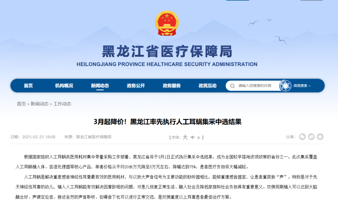 根據(jù)國家組織人工耳蝸類醫(yī)用耗材集中帶量采購工作部署,黑龍江省于3月1日正式執(zhí)行集采中選結果,成為全國較早落地該項政策的省份之一。此次集采覆蓋人工耳蝸植入體、言語處理器等核心產品,單套價格從平均20余萬元降至5萬元左右,降幅達到75%,患者醫(yī)療負擔將大幅減輕。