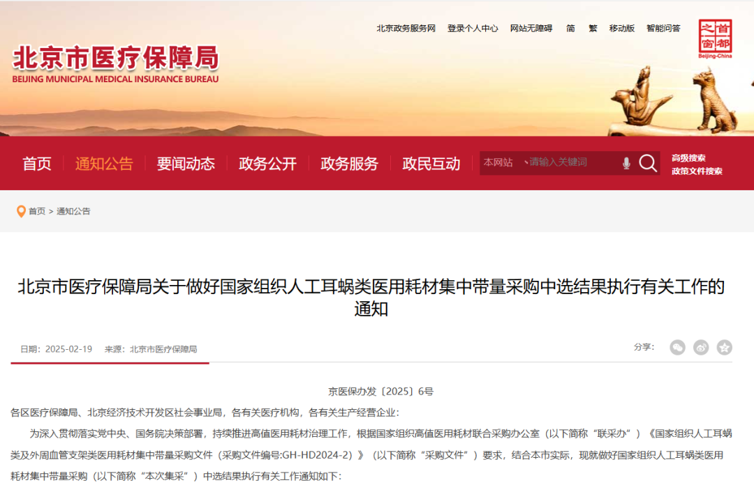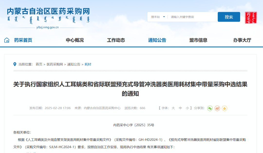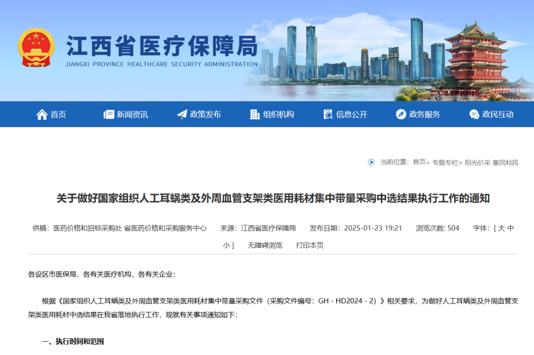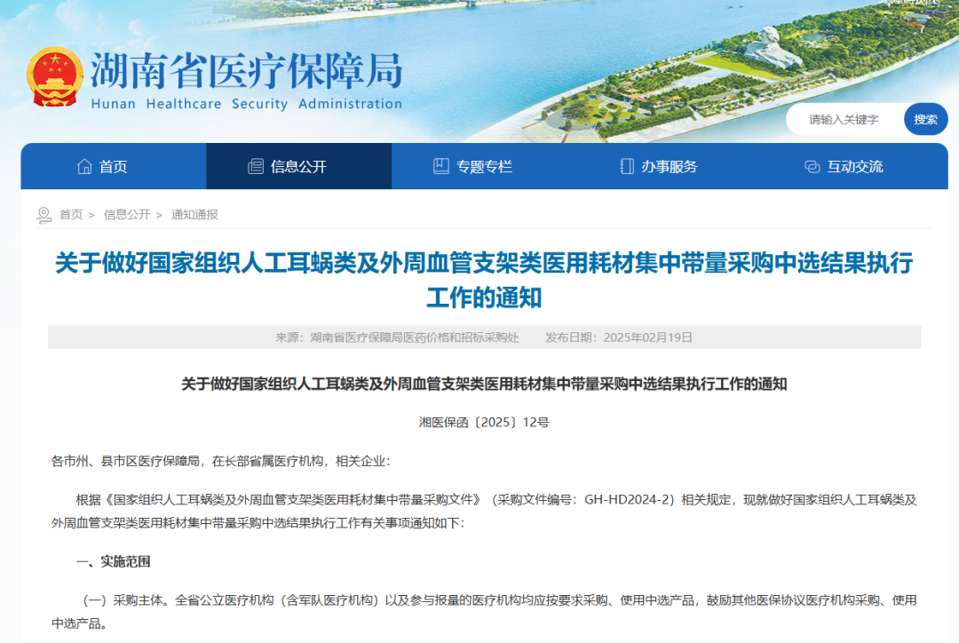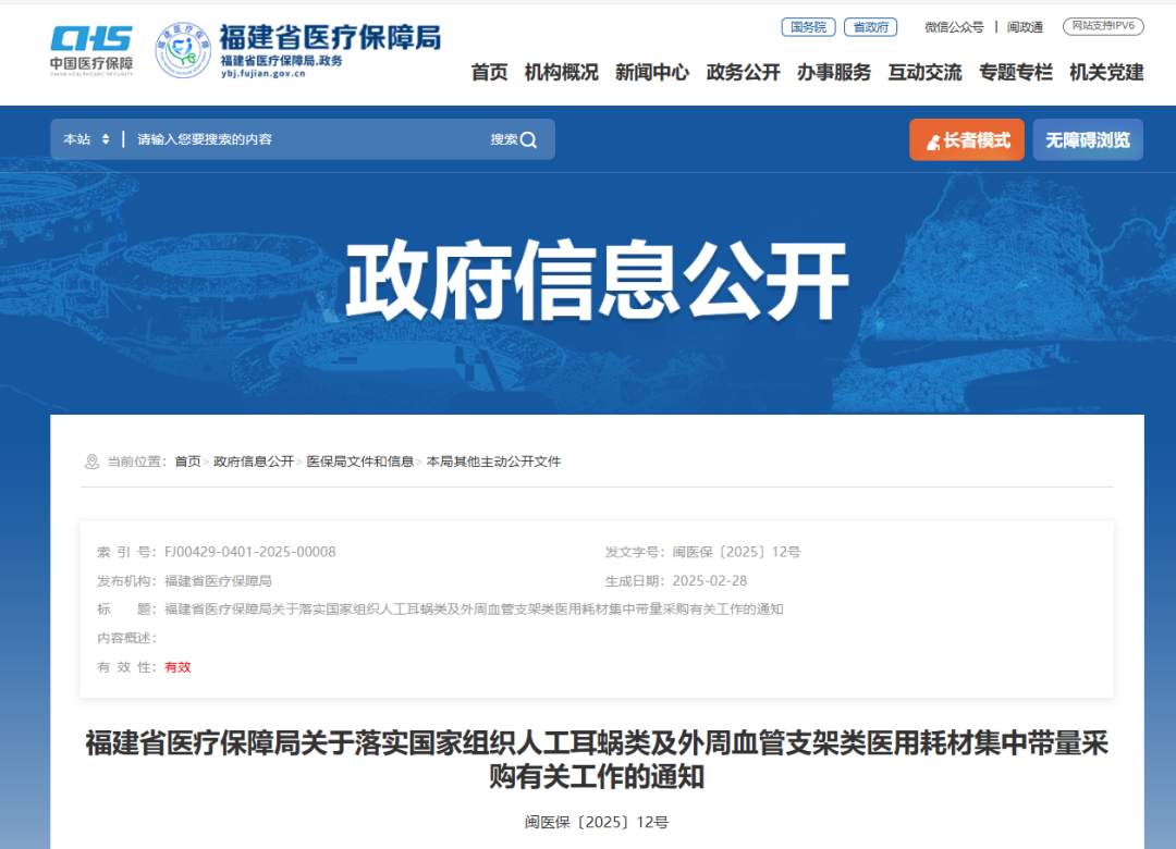 2月28日,福建醫(yī)保局發(fā)布《關于落實國家組織人工耳蝸類及外周血管支架類醫(yī)用耗材集中帶量采購有關工作的通知》,其中指出,人工耳蝸類中選結果于2025年3月7日在福建省醫(yī)療保障信息平臺藥品和醫(yī)用耗材招標和采購交易子系統(tǒng)掛網,3月11日起正式執(zhí)行;外周血管支架類中選結果于5月12日在招采子系統(tǒng)掛網,5月14日起正式執(zhí)行。