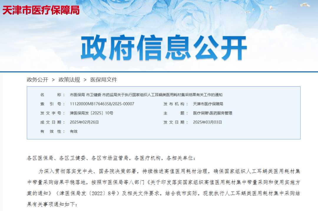 3月3日,天津市醫(yī)保局聯(lián)合有關部門發(fā)布了《關于執(zhí)行國家組織人工耳蝸類醫(yī)用耗材集采結果有關工作的通知》,自3月1日起,天津市相關患者可以使用上集采降價后的人工耳蝸中選產品,標志著國家集采人工耳蝸中選結果在津正式落地。