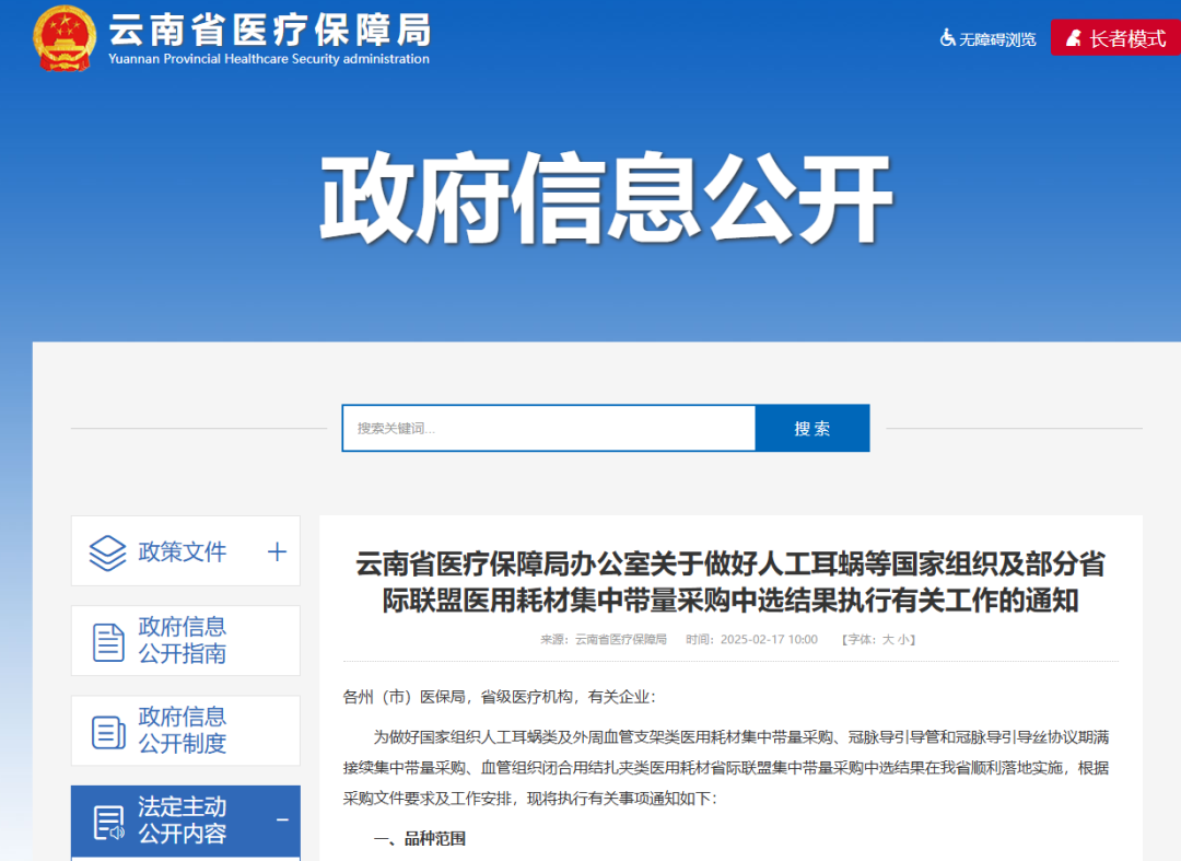 2月7日,云南省醫(yī)療保障局正式發(fā)布《云南省醫(yī)療保障局辦公室關于做好人工耳蝸等國家組織及部分省際聯(lián)盟醫(yī)用耗材集中帶量采購中選結果執(zhí)行有關工作的通知》,規(guī)定國家組織人工耳蝸類醫(yī)用耗材集中帶量采購、冠脈導引導管和冠脈導引導絲協(xié)議期滿接續(xù)集中帶量采購、血管組織閉合用結扎夾類醫(yī)用耗材省際聯(lián)盟集中帶量采購中選結果自2025年3月1日起執(zhí)行。