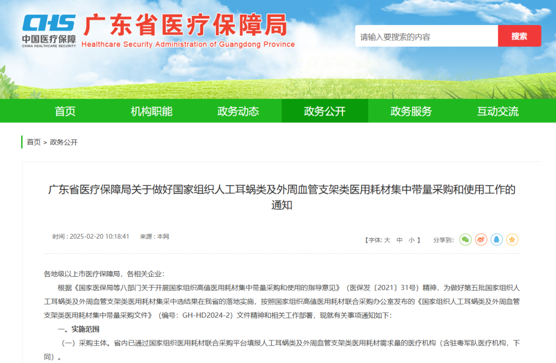 2月20日,廣東省醫(yī)療保障局發(fā)布了《關于做好國家組織人工耳蝸類及外周血管支架類醫(yī)用耗材集中帶量采購和使用工作的通知》,人工耳蝸、外周血管支架兩類高值醫(yī)用耗材國家集采中選結果將分階段在廣東全面執(zhí)行,人工耳蝸單套(含植入體、處理器)價格從平均20余萬元降至5萬元左右。