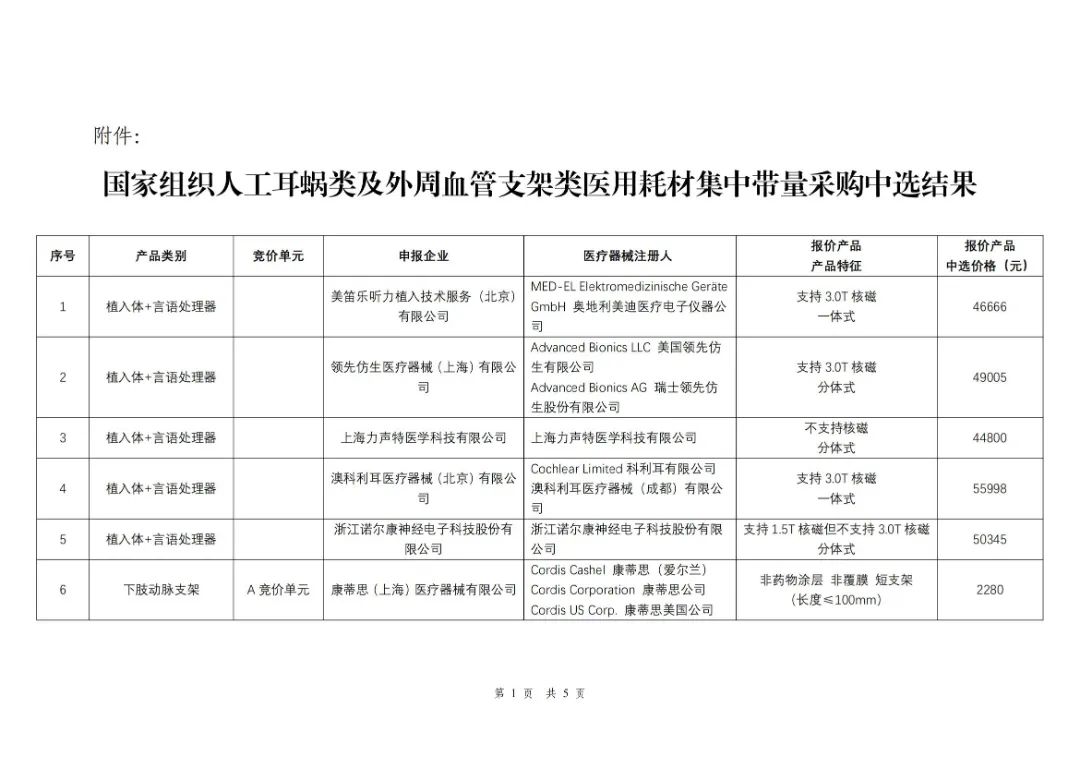 其中,人工耳蝸類集采中選結果自3月1日起執(zhí)行,外周血管支架類集采中選結果自5月1日起執(zhí)行,兩類耗材采購周期均為3年。