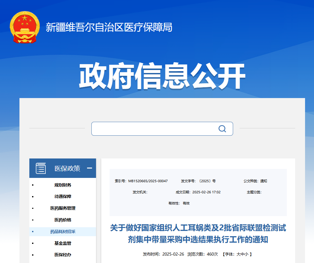 3月3日,新疆維吾爾自治區(qū)醫(yī)療保障局發(fā)布通知,明確自2025年3月1日起正式執(zhí)行人工耳蝸集中帶量采購中選結果,并于3月15日同步落地安徽2023年體外診斷試劑、江西腎功和心肌酶生化類檢驗試劑集采成果。