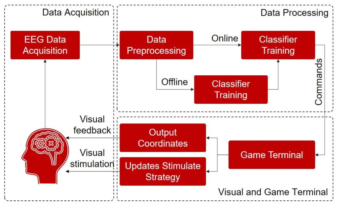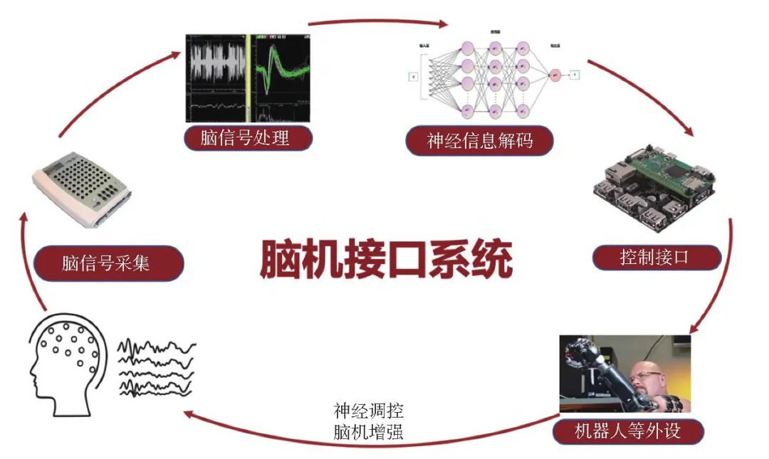 而腦機(jī)接口系統(tǒng)作為一種多學(xué)科交叉融合的復(fù)雜體系,其集成了神經(jīng)科學(xué)、信號(hào)處理、計(jì)算機(jī)科學(xué)、人工智能等多學(xué)科知識(shí),無(wú)論是侵入式還是非侵入式的腦機(jī)接口技術(shù),其系統(tǒng)都主要由用戶(大腦)、腦信號(hào)采集、腦信號(hào)處理與解碼、控制接口、機(jī)器人等外設(shè)和神經(jīng)反饋構(gòu)成。其中,最核心的組件是腦信號(hào)采集、腦信號(hào)處理與解碼以及控制接口三部分。
