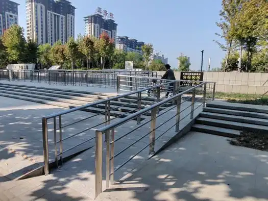 無障礙通道,通常在有臺(tái)階的地方會(huì)修建斜坡,并配備扶手欄桿,旨在為輪椅使用者及腿力不佳者提供便捷的通行方式。此外,無障礙設(shè)施還包括專為這類人群設(shè)計(jì)的停車位。