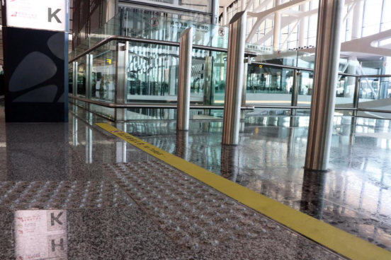 除入樓后有引導(dǎo)至綜合問(wèn)詢柜臺(tái)的連續(xù)行進(jìn)盲道,在航站樓內(nèi)部的其他區(qū)域也設(shè)置了不連續(xù)的提示盲道,在盲道途中由服務(wù)人員協(xié)助通行,體現(xiàn)機(jī)場(chǎng)的人性化服務(wù)。